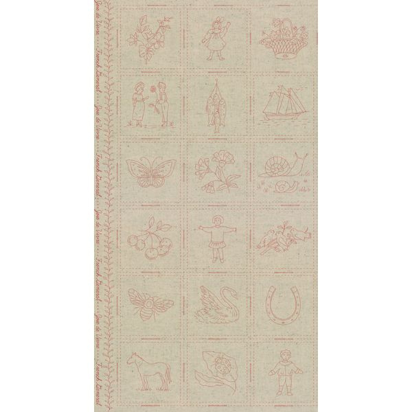 Ons nieuwe Joie de Vivre Broderie-paneel is in rood gedrukt op naturelkleurig Mochi-linnen - een prachtige, makkelijke basis om op te borduren. Knip deze blokken uit en maak er een schattige babydeken of een grotere quilt van met behulp van een Joie de Vivre Jelly Roll.