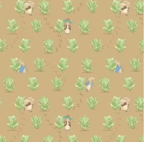 Artikelnummer: CD17253 OverzichtQuiltstof met afbeelding van Peter Rabbit en Benjamin Bunny tussen de kool in de groentetuin.