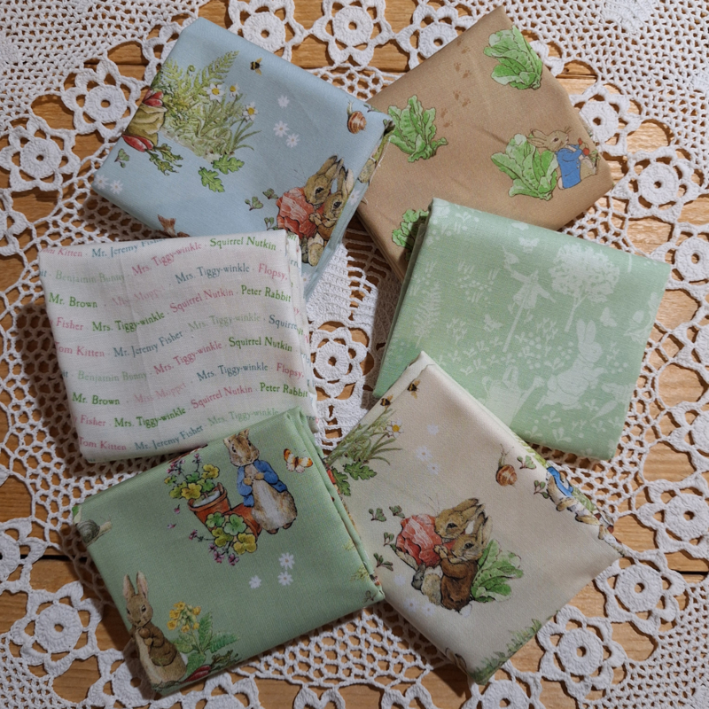 OverzichtStoffenpakket met 6 verschillende stoffen van Peter Rabbit.