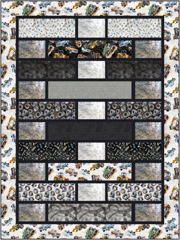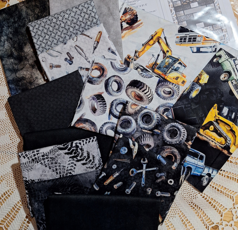 OverzichtCompleet pakket voor het maken van een stoere quilt met graafmachines, gereedschap, autobanden, bandensporen en rijplaten.