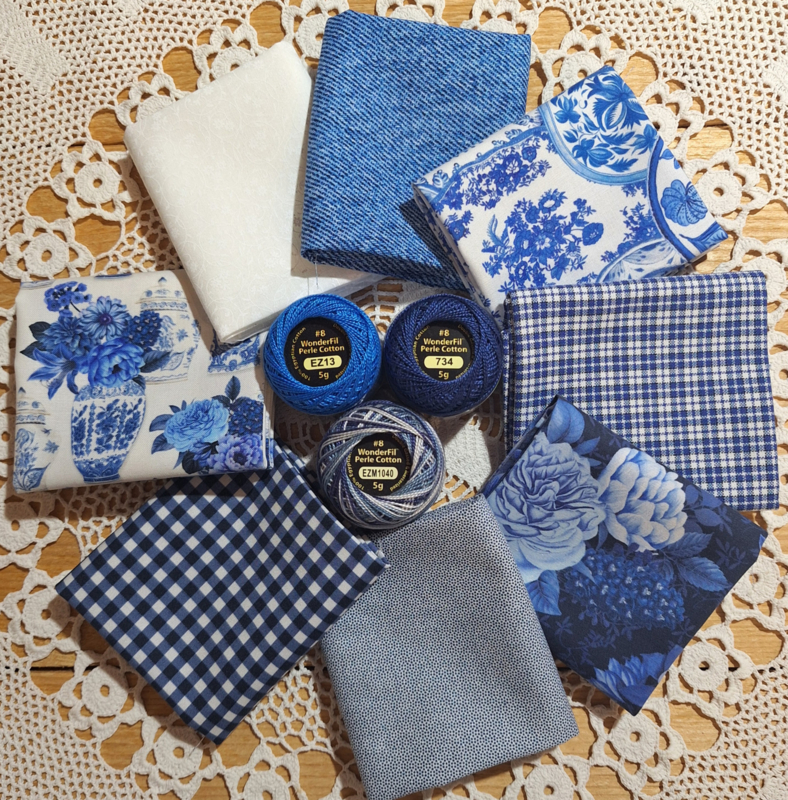 Stofpakket 280625 F8Stofpakket met 6 quiltstoffen in blauw-roze-ecru.