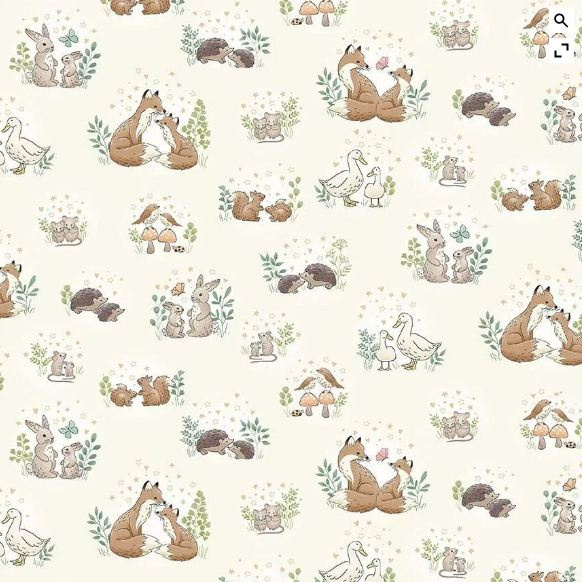 Little Ones Hugs || quiltstof met vosjes, eenden, konijnen, muisjes, egels en vogelsHet vosjestafereel is ong. 5 cm. x 6 cm.